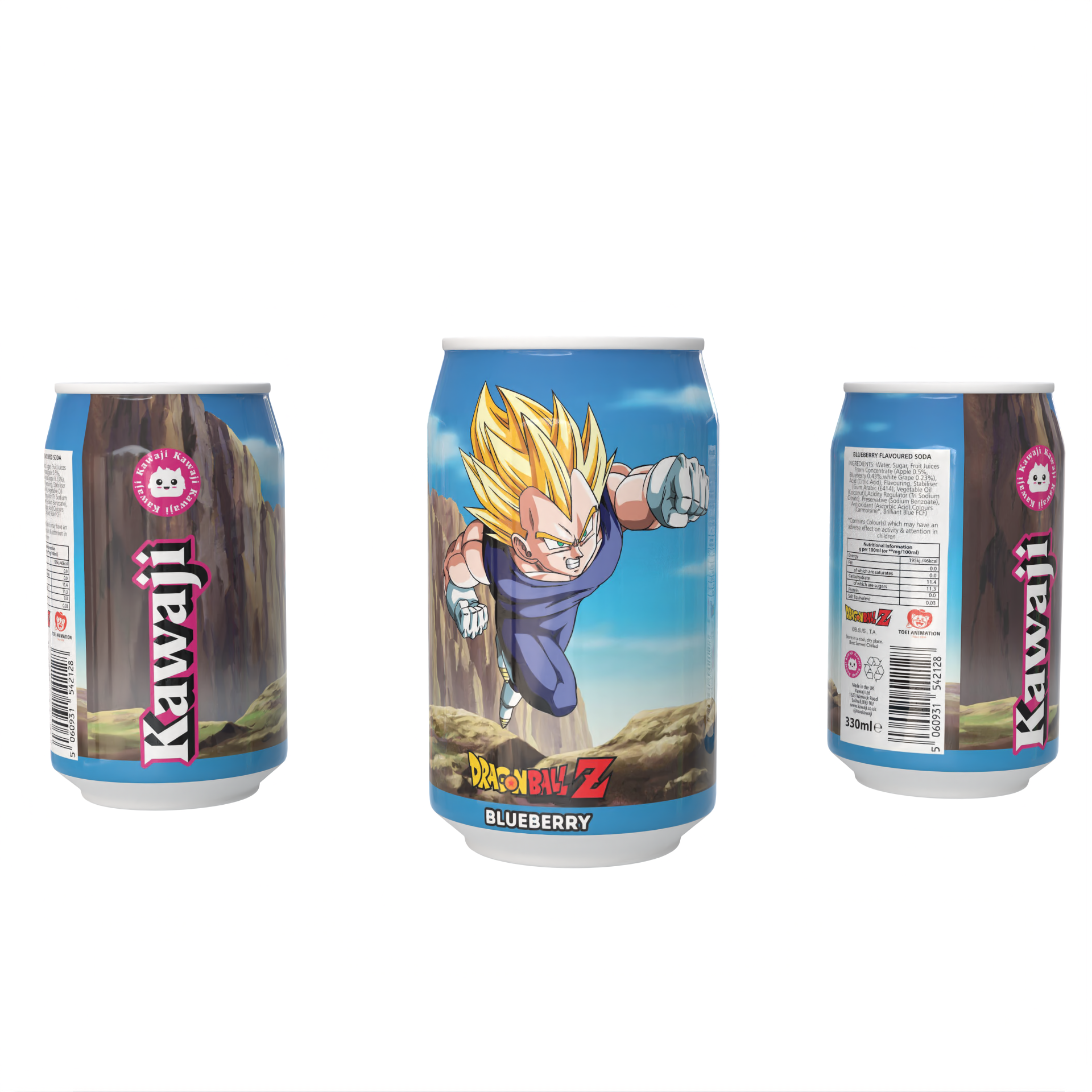 The product is a soda can featuring Vegeta's Blue Fury, offering a blueberry-flavoured drink. It's a special edition fruity drink, not just a soda. The collaboration between Kawaji and Dragon Ball Z adds an extra layer of appeal for fans.
